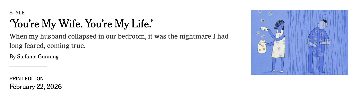 One month before Jonathan’s embolism, in September of 2023, I started a new job, one where I could not default to my comfort zone of “copywriter with her headphones on.” In this job, I was expected to lead, to collaborate, to win new business, to crack every brief with brilliant ideas. Which meant that even on mornings when I was hollowed out by fear, I put on the diamond studs my best friend gave me, and the necklace from my mother, and enough makeup to look like I’d tried, and told jokes in client meetings and pretended everything was fine.