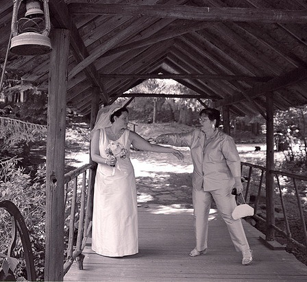 My mother, gorgeous in a silk suit, dancing with me moments before my wedding in 2004.